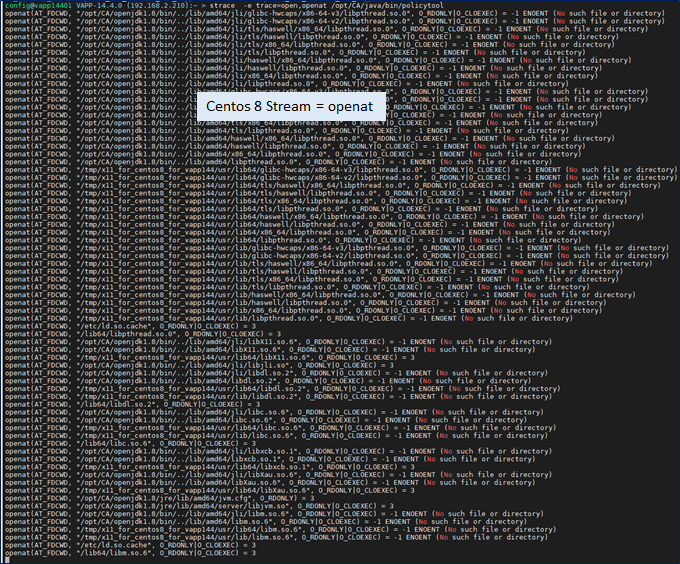 Using “strace -e trace=open,openat /opt/CA/java/bin/policytool” we can see the files that were found ” = 3″ versus those not found “= -1 ENOENT (No such file or directory)”. Some files are required for Centos 8 Stream and others for Centos 6.4