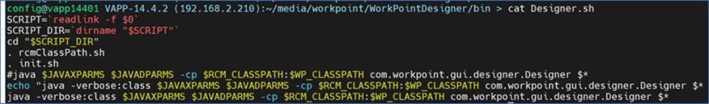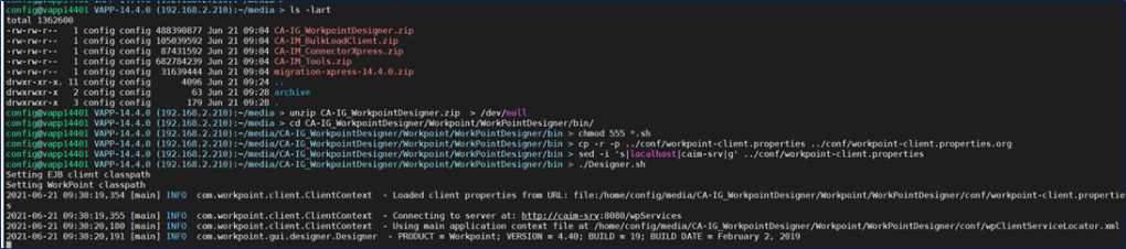 config@vapp14401 VAPP-14.4.0 (192.168.2.210):~/media > unzip CA-IG_WorkpointDesigner.zip > /dev/null config@vapp14401 VAPP-14.4.0 (192.168.2.210):~/media > cd CA-IG_WorkpointDesigner/Workpoint/WorkPointDesigner/bin/ config@vapp14401 VAPP-14.4.0 (192.168.2.210):~/media/CA-IG_WorkpointDesigner/Workpoint/WorkPointDesigner/bin > chmod 555 *.sh config@vapp14401 VAPP-14.4.0 (192.168.2.210):~/media/CA-IG_WorkpointDesigner/Workpoint/WorkPointDesigner/bin > cp -r -p ../conf/workpoint-client.properties ../conf/workpoint-client.properties.org config@vapp14401 VAPP-14.4.0 (192.168.2.210):~/media/CA-IG_WorkpointDesigner/Workpoint/WorkPointDesigner/bin > sed -i 's|localhost|caim-srv|g' ../conf/workpoint-client.properties config@vapp14401 VAPP-14.4.0 (192.168.2.210):~/media/CA-IG_WorkpointDesigner/Workpoint/WorkPointDesigner/bin > ./Designer.sh