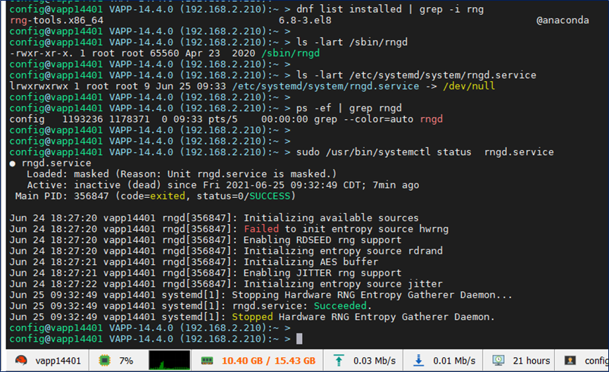 However, since vApp r14.4 was release, we can focus on this Virtual Appliance which is running Centos 8 stream. The RNGD service here is disabled (masked) but can be re-enabled for our use with the sudo command. There is no current documented method for RNGD on vApp r14.4 at this time, but the steps below will show an approved way using the ‘config’ userID and sudo commands.