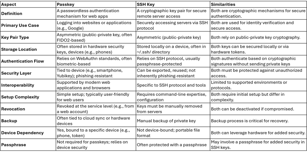 I wanted to compare the similarities and the differences between passkey architecture and ssh keys (used for many years). This table summarizes the distinctions and overlaps between passkeys (a modern, browser-driven standard for web authentication) and SSH keys (a traditional tool for server authentication). This may help others to see how the evolution has progressed from behind the scenes with servers to public use with browsers.