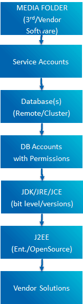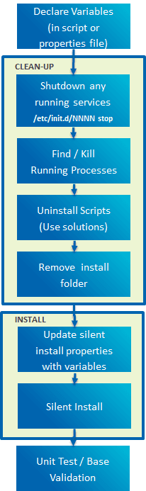 - Any software installation that require input for service accounts; passwords; or other variables will be address with an input properties file and/or script variables that will be defined at the header of the script.