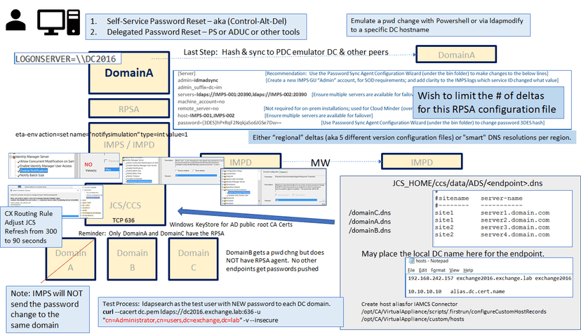 Using various MS Active Directory processes, we can emulate a delegated or self-service password change early during the configuration cycle, to confirm deployment is correct. The below example uses MS Powershell to select a writable MS ADS Domain Controller to update a user's password. We can then monitor the logs at all tiers for completion of this password change event.