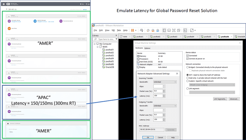 To review the solution's ability to meet the latency issues, we introduced a test environment to emulate the global latency for deployment use-cases, change password use-cases, and standard CrUD use-cases. There is a feature within VMWare Workstation, that allows emulation of degraded network traffic. This process was a very useful planning/validation tool to lower rollback risk during production deployment.