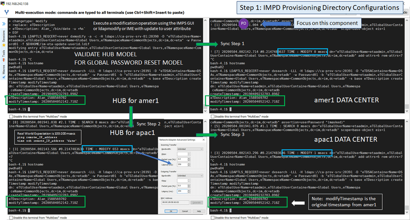 The second challenge was a deployment challenge of the IMPS component for its embedded "registry files/folders". The prior embedded copy process was observed to be using standard "scp". With a WAN latency, the scp copy operation may take more than 30 seconds. Our testing with the Virtual Appliance showed that a simple copy would take over two (2) minutes for multiple small files. After reviewing with CA support/engineering, they provided an updated copy process using "rsync" that speeds up copy performance by >100x. Before this update, the impact was provisioning tier deployment would fail and partial rollback would occur.