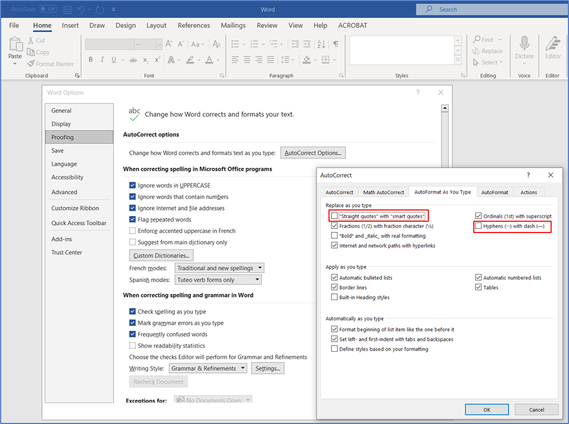 - Disable Autocorrect: If you frequently copy and paste between Office Suite and other platforms, consider disabling these specific autocorrect features for these two (2) common ones (dash/quotes).