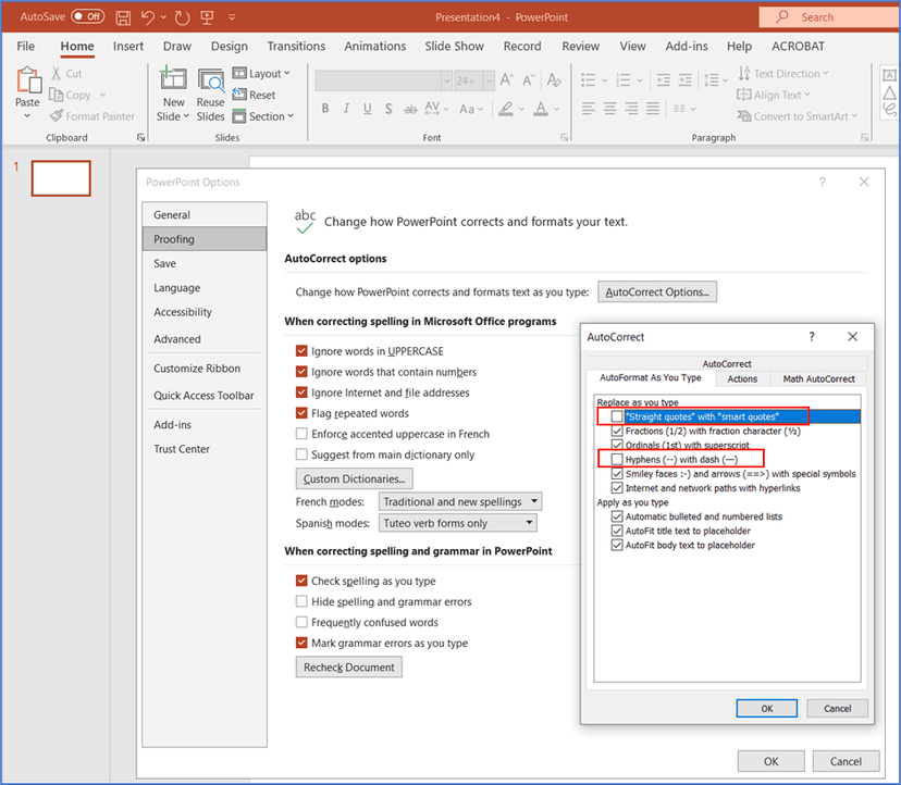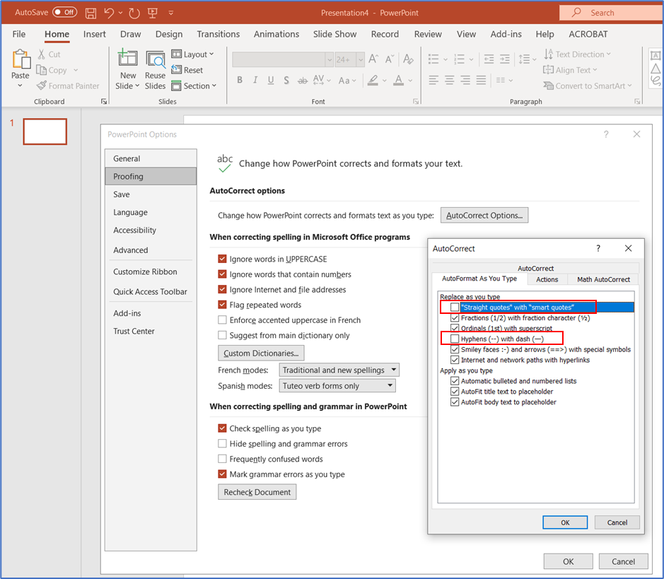 Location of auto-correction of dash (-) to emdash (--) & quotes in MS Powerpoint