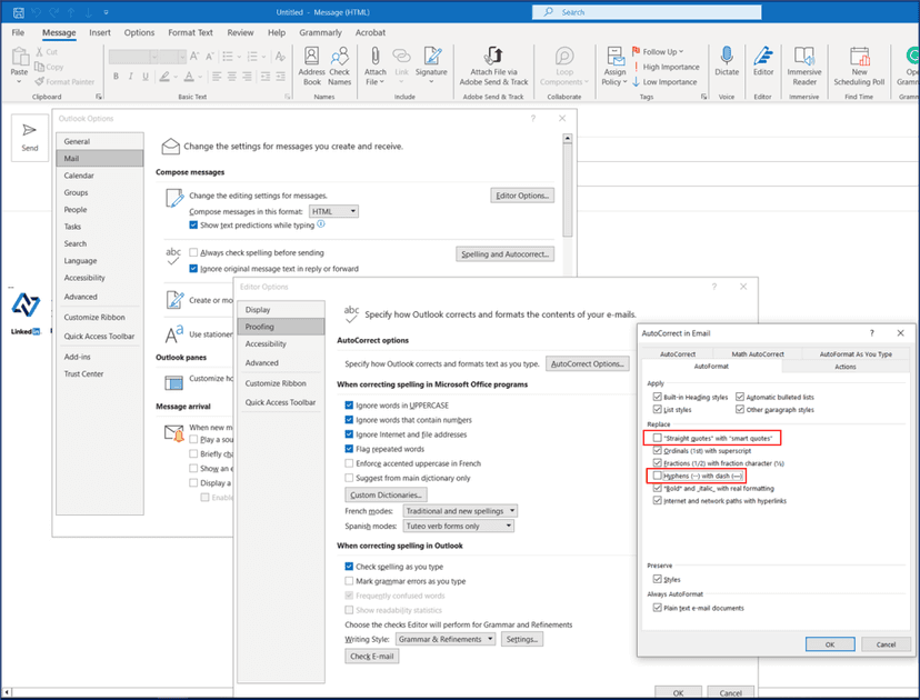 Location of auto-correction of dash (-) to emdash (--) & quotes in MS Outlook