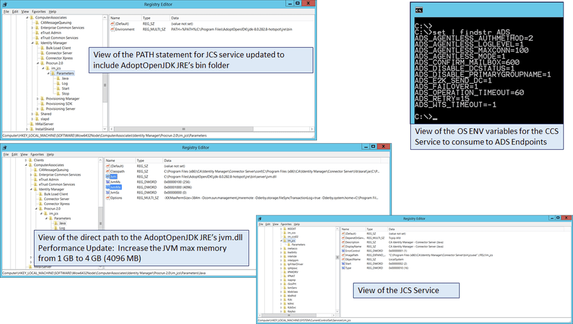 The below image below shows in the MS Windows Registry for the JCS Service (Procrun 2.0/im_jcs) the key value pairs that are updated for AdoptOpenJDK. https://adoptopenjdk.net/ If managing Active Directory, please review your OS environmental variables to control the behavior from the CCS Service to Active Directory.