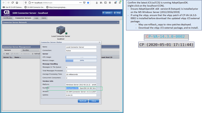 Other improvement include updating the JAVA that is supporting the JCS Service. CA/Symantec now recommends using AdoptOpenJDK. The documentation now explains how this may be updated in-place. Or as we prefer to reinstall and allow the installer to update the path statements for AdoptOpenJDK.