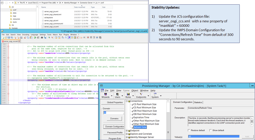 The default JCS Service configuration file has knowledge of the connection pool and timeouts, but appears to be missing the "maxWait" token defined. If we are willing to wait 5-10 minutes for the JCS Service to reset its knowledge of the CCS service, we can leave the default. However for a large environment, we have found that lowering the wait times will greatly avoid the delays in transactions when there is stoppage. We have identified two (2) configuration parameters that will assist with the long term stability of the solution. Adding the "maxWait" of 60 seconds (60000 milliseconds) to the JCS configuration file for CCS service and updating the default IM Provisioning Server domain configuration parameter of "Connections/Refresh Time" to 90 seconds.