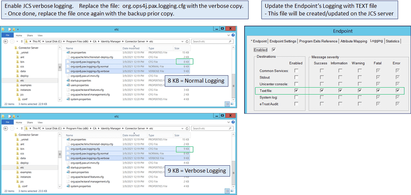 Important Logging Note: Enable the new IM r14.3cp2 feature to auto rotate your CCS ADS log. Avoid stop/start of the CCS Service yourself, that may interrupt the JCS behavior to the CCS Service (error communicating to localhost:20402 will display in JCS logs). New file(s): Connector Server\ccs\data\ADS\<Endpoint_Name>.logconfig