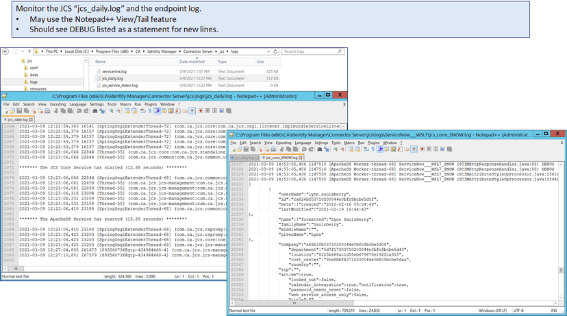 To monitor the JCS logs, there are several tools that will assist, but we find that the latest releases of Notepad++ allow for "tailing" the active JCS logs.