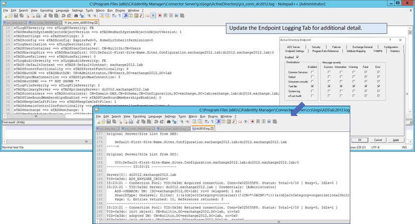 Example of verbose logs for Active Directory via the CCS's ADS and JCS logs.