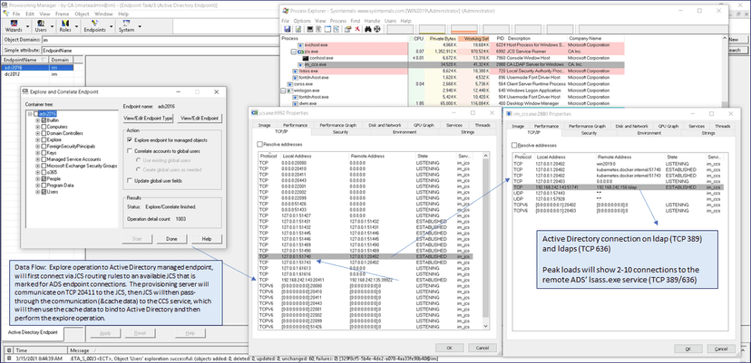 To understand how the JCS Service manages the CCS Service (via localhost TCP 20402), we can review two (2) files and use MS Sysinternals Process Explorer to view the JCS Service starting the CCS Service via the command "net start im_ccs". The JCS Service will now have access to update the CCS service's cache with information for a managed endpoint, e.g. Active Directory.