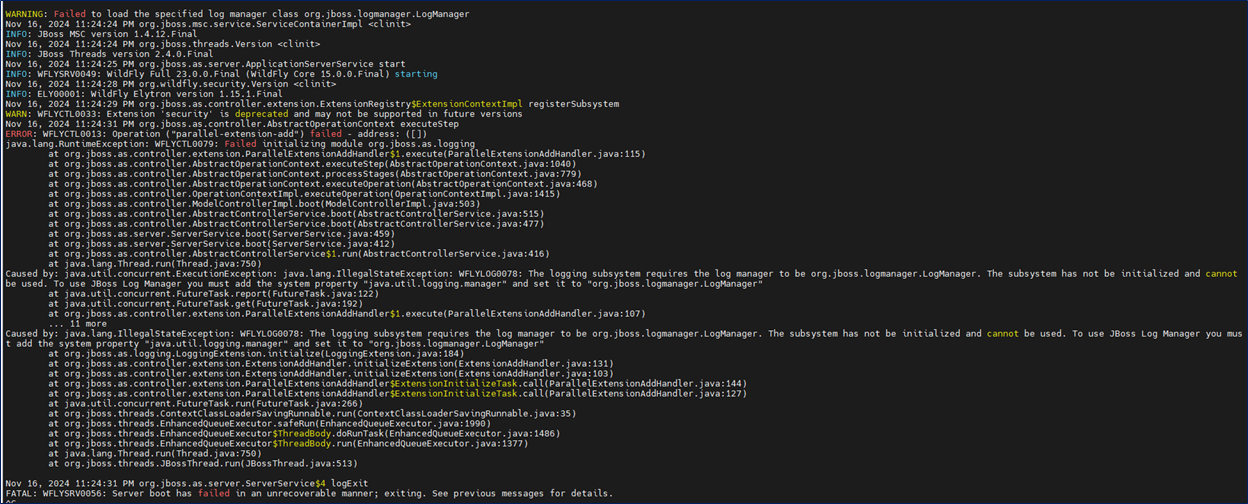 Caused by: java.util.concurrent.ExecutionException: java.lang.IllegalStateException: WFLYLOG0078: The logging subsystem requires the log manager to be org.jboss.logmanager.LogManager. The subsystem has not be initialized and cannot be used. To use JBoss Log Manager you must add the system property "java.util.logging.manager" and set it to "org.jboss.logmanager.LogManager"