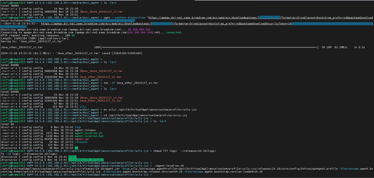 ~/media/dxoi_agent > wget --content-disposition "https://apmgw.dxi-na1.saas.broadcom.com/acc/apm/acc/downloadpackage/7XXXXXXXXXX?format=archive&layout=bootstrap_preferred&packageDownload SecurityToken=ZZZZZZZZZZZ"