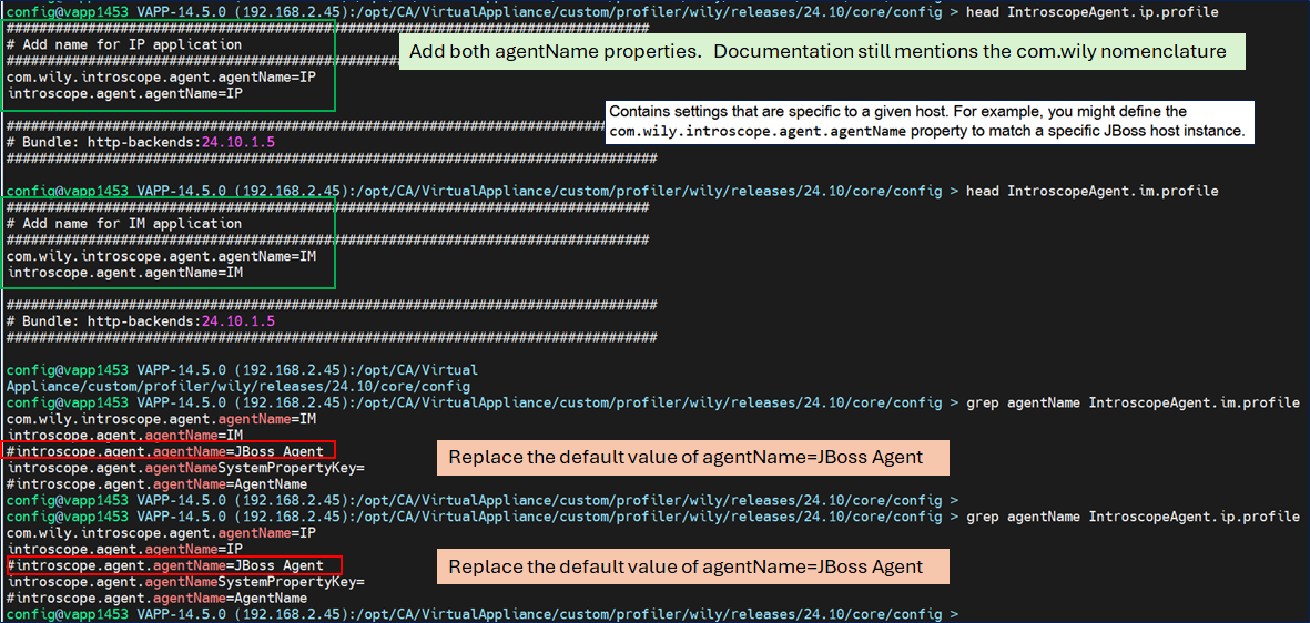 When we have two (2) or more applications using the same profile, we may see DX O2 attempt to join them together in the metrics UI. To avoid this, lets make two (2) copies of the Introscope.profile and add our own "agentName" for each. Do NOT forget to comment out the default of "introscope.agent.agentName=JBoss Agent". We added "com.wily.introscope.agent.agentName" as well, since it is called out in the online documentation.