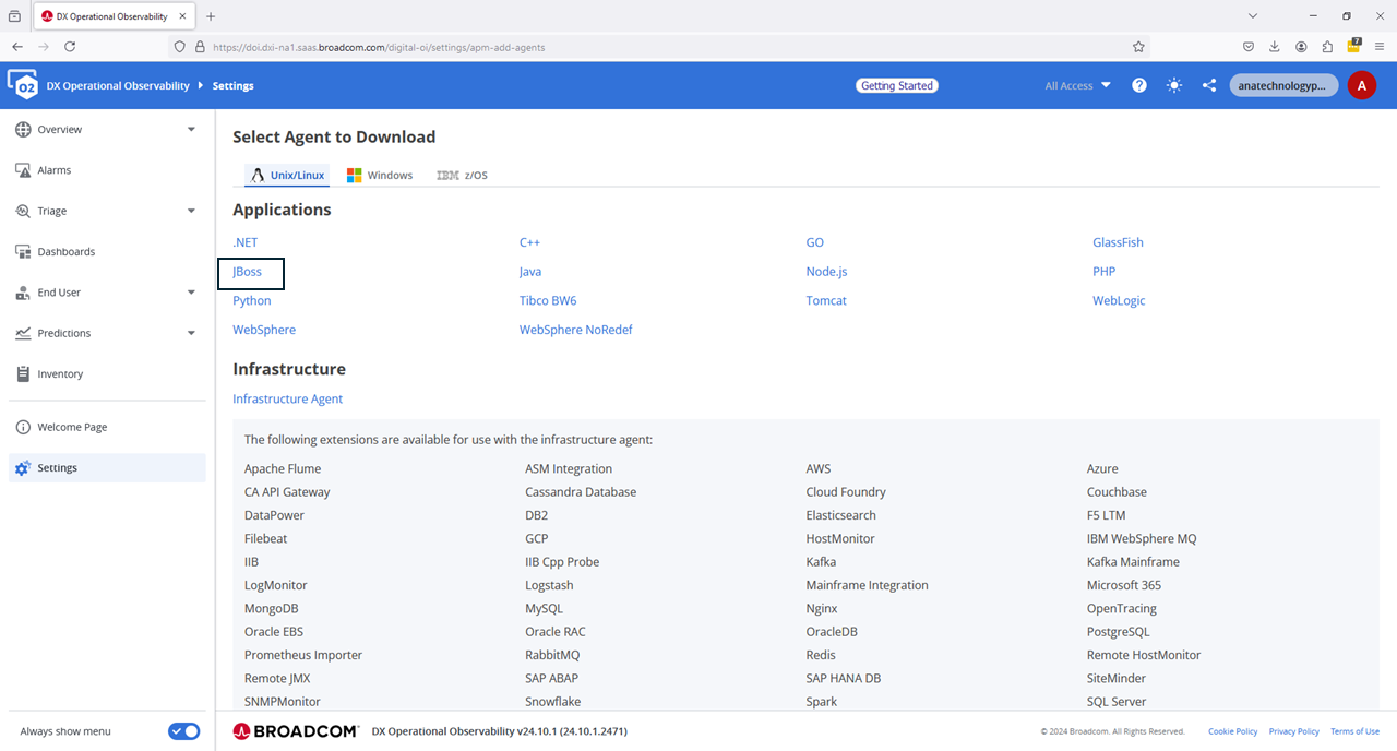 After you login to your DX OI/O2 instance, navigate to the settings/agents section. You can select an Agent, and your custom authentication token to use it will be embedded in the package. We plan to use the javaagent being offered for Wildfly (aka JBOSS) . Select this agent.