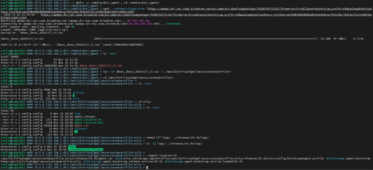Create a local media folder, then proceed to download the DX 02 agent. After the download is successful, we will extract the agent into a known folder used on the IGA Virtual Appliance for "java profilers". Since the files are owned by the 'config' user, and we need the 'wildfly' user to have access to the log folder, please chmod 777 to both log folders to avoid any startup issues for the Wildfly applications. You may leave the rest of the file/folder permissions as is.