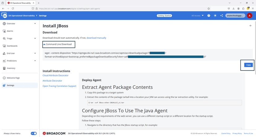 When the screen displays, expand the "Command Line Download". We will use the wget command to directly download this agent to our Virtual Appliance that has internet access. Otherwise, download the agent to your workstation, and then file transfer it to your Virtual Appliance that has Wildfly running on it.