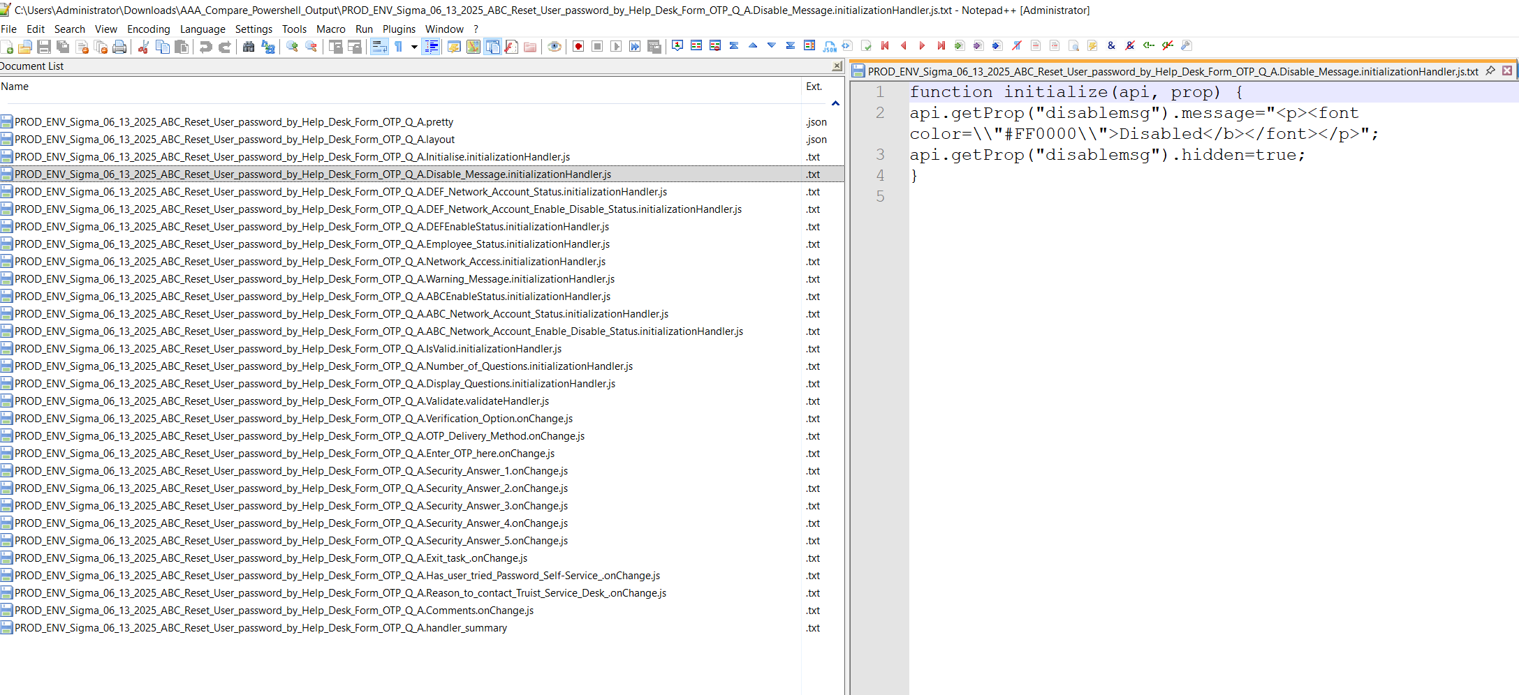 - Use PowerShell to extract JS blocks per form and store them as external
