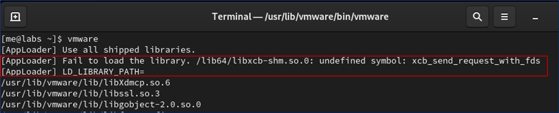 vmware startup error message: /lib64/libxcb-shm.so.0: undefined symbol: xcb_send_request_with_fds
