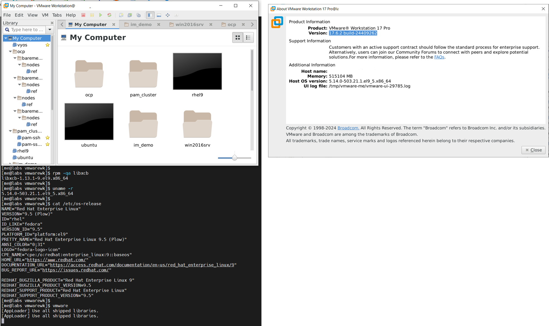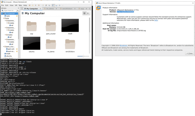 VMware Workstation 17.6.2 appears to install with no issues on Red Hat 9.5. However, we do see an issue with running the GUI of vmware with an embedded library file within VMware Workstation. We see an error message when running the vmware binary regarding the library of libxcb.