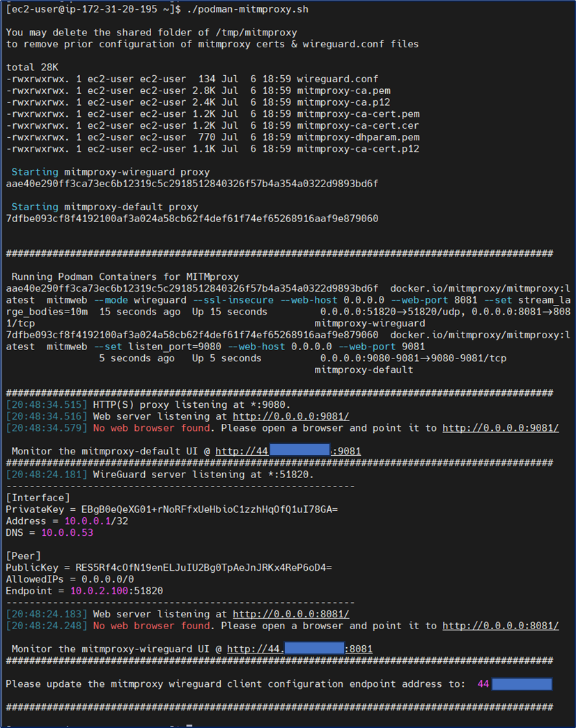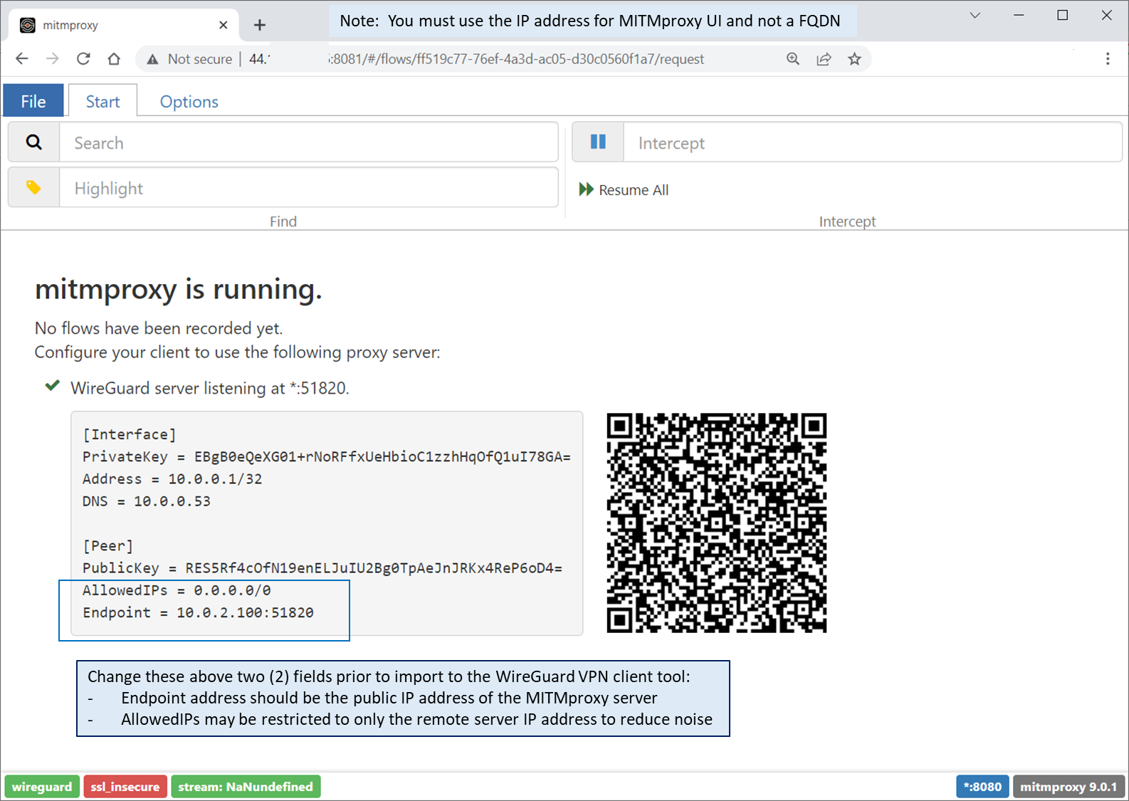 The WireGuard client configuration will be provided in three (3) places: the MITMproxy logs (podman logs mitmproxy), the text file wireguard.conf (if podman/docker volumes are enabled), and the MITMproxy UI. The QR code is enabled for mobile phone use, but since the public IP address provided is not correct in this view, you will need to manually edit this configuration on your mobile phone during those use-cases to have the correct endpoint IP address.