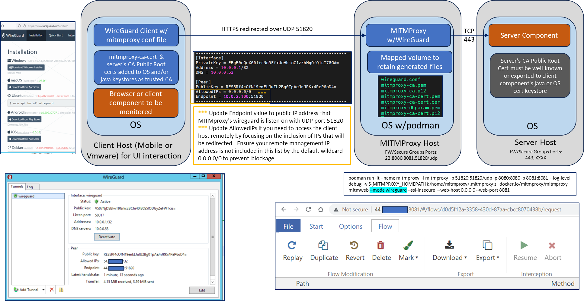 - Deployment of MITMproxy using podman (or docker) with WireGuard mode/configuration