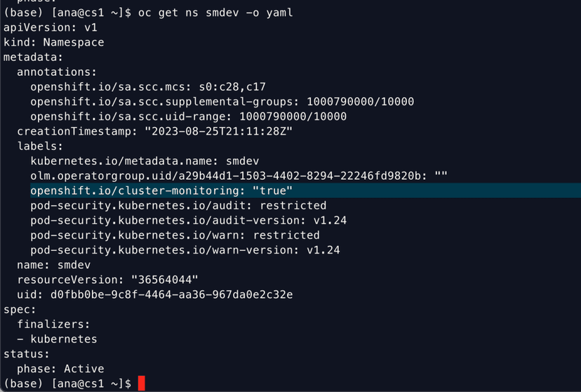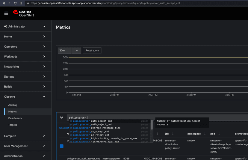 Once the CA SSO helm chart is installed with metrics enabled, we must also ensure that the namespace in which CA SSO gets deployed has openshift.io/cluster-monitoring label set as true.