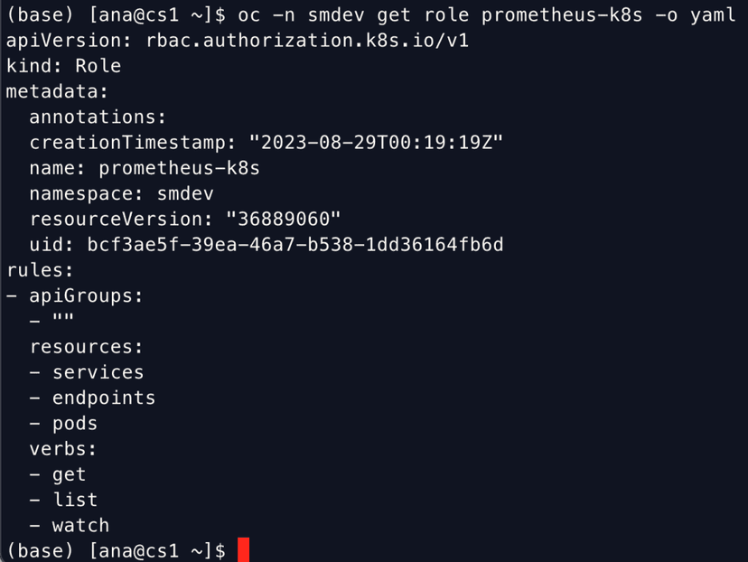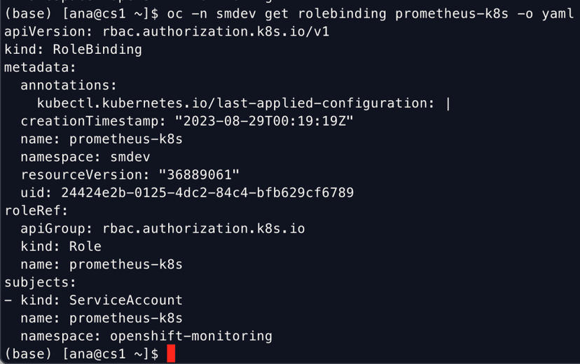 Also ensure that a role binding exists to allow the service account (prometheus-k8s) in the openshift-monitoring namespace access to the role which allows monitoring of resources in the target (smdev) namespace.