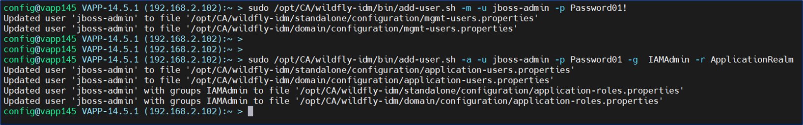 sudo /opt/CA/wildfly-idm/bin/add-user.sh -a -u jboss-admin -p Password01! -g IAMAdmin -r ApplicationRealm