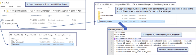 - On the "jump server" under the Provisioning Server\pam\ADS folder copy the etapam.dll to the IMPS \bin folder. Then copy the etapam_id.conf configuration file to the \pam parent folder. Update the parameters in this file. Set the enable= parameter to yes. Set the domain= to either the MS AD Domain or use the FQDN hostname of the ADS Domain Controller (DC). If we use the FQDN hostname of the DC the "jump server" does NOT have to be made a member of the MS AD Domain. Save the file and restart the "CA Identity Manager - Provisioning Server"