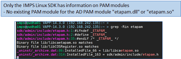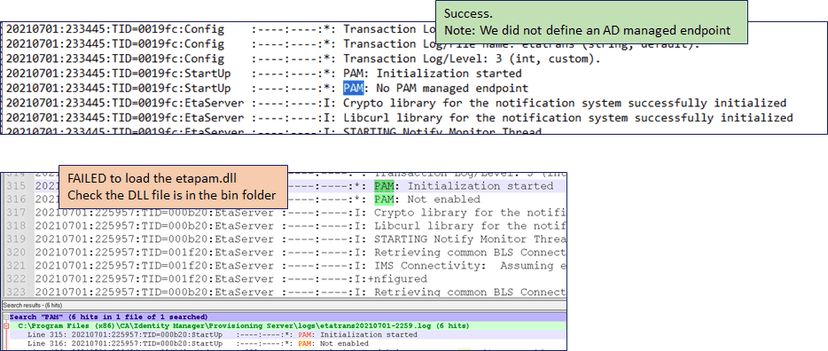 - Validate PAM functionality in the IMPS etatrans log is enabled. We will see two (2) entries: PAM: Initialization started (same for all use-cases) and PAM: Not enabled or No PAM managed endpoint. We want "PAM: No PAM managed endpoint" - That is an extra feature we could enable, but do not require for the "jump server" scenario.