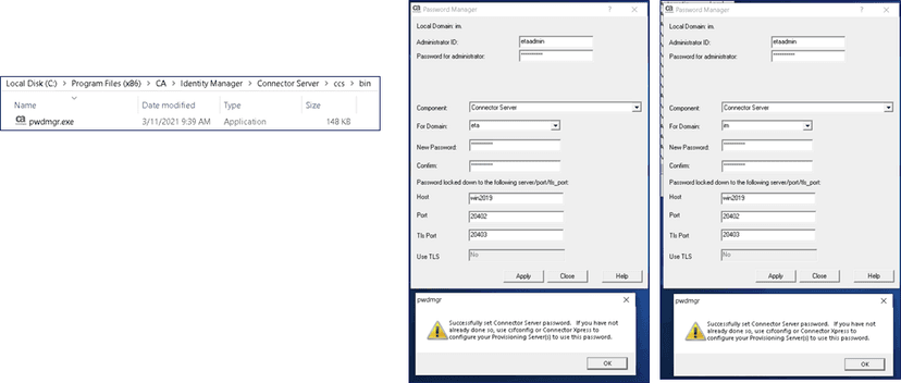 C:\Program Files (x86)\CA\Identity Manager\Provisioning Server\bin>csfconfig.exe auth=etaadmin show EtaSSL.initialize: CRYPTO_library_init: 1 EtaSSL.initialize: SSL_library_init: 1 Enter your authentication password: C:\Program Files (x86)\CA\Identity Manager\Provisioning Server\bin>echo Password01 > c:\imps.pwd C:\Program Files (x86)\CA\Identity Manager\Provisioning Server\bin>csfconfig.exe auth=etaadmin add name=pamjcs host=192.168.242.143 pass=c:\imps.pwd br-add=@ debug=yes port=20411 EtaSSL.initialize: CRYPTO_library_init: 1 EtaSSL.initialize: SSL_library_init: 1 Enter your authentication password: Created CS object with name = pamjcs C:\Program Files (x86)\CA\Identity Manager\Provisioning Server\bin>csfconfig.exe auth=etaadmin remove name=pamjcs EtaSSL.initialize: CRYPTO_library_init: 1 EtaSSL.initialize: SSL_library_init: 1 Enter your authentication password: