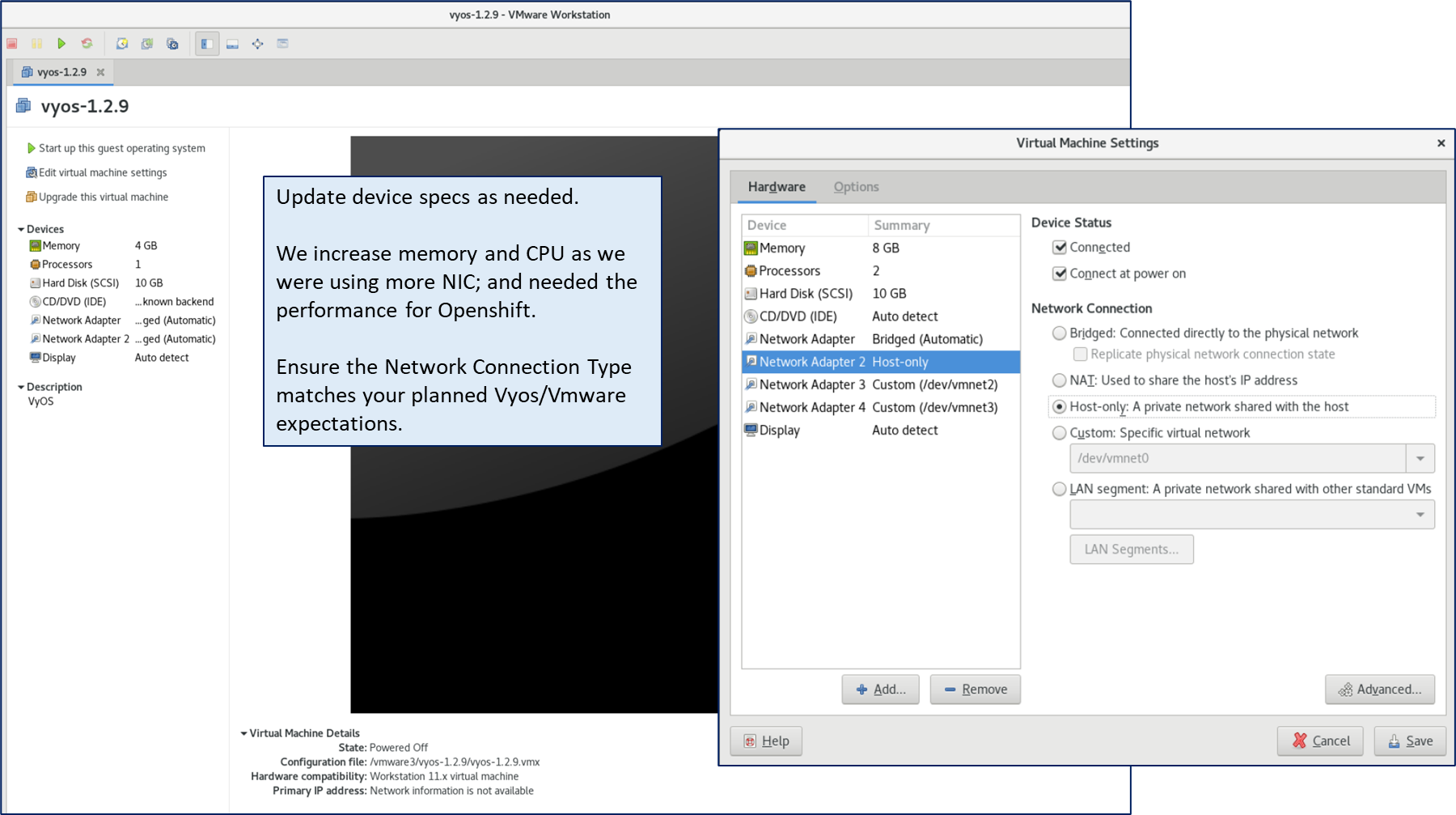 Since we planned to have multiple host network segments to manage large data for OpenShift/Kubernetes, we bumped up the VMware guest OS specs from 1 vCPU 4 GB RAM to 2 vCPU 8 GB RAM. And adjusted the extra Network Adapters to be Host-only or Custom (Host-Only) networks.
