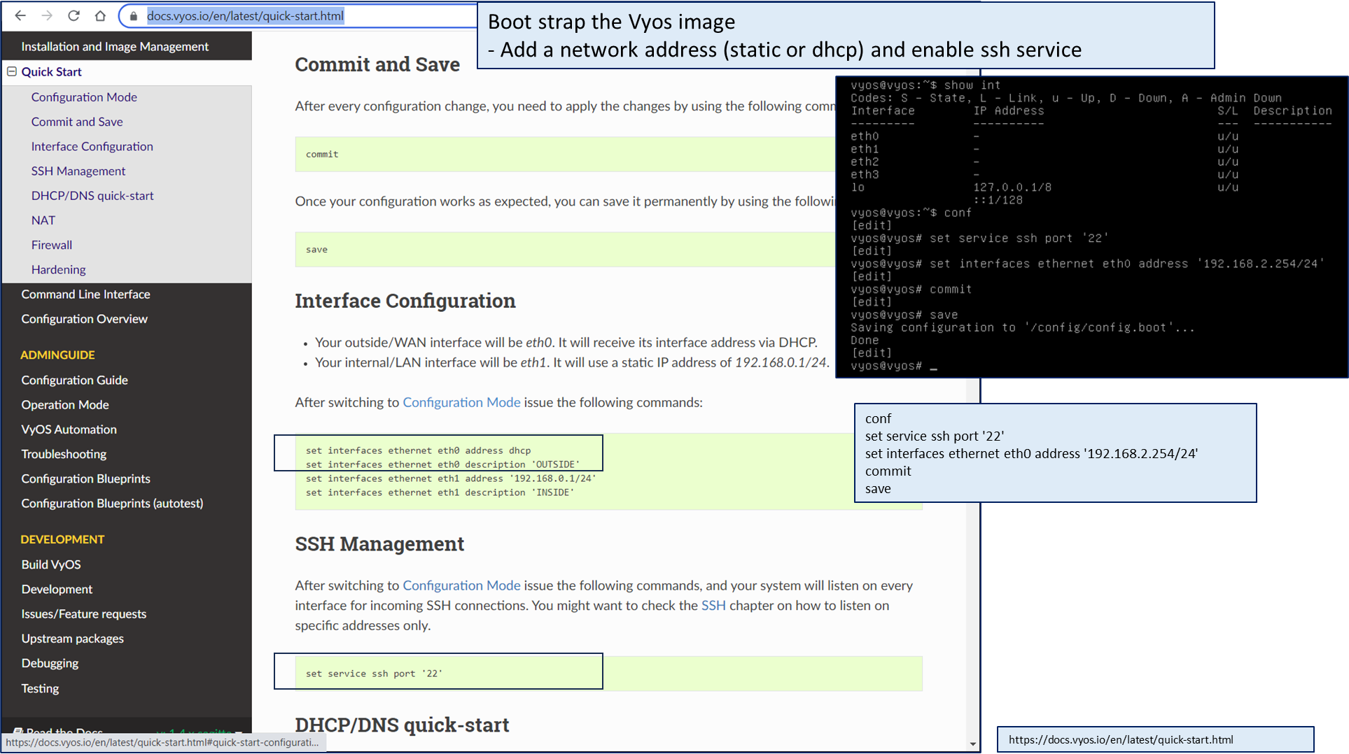 # Step 0: Boot strap first interface (via vmware console of vyos running image - after login with vyos / vyos)