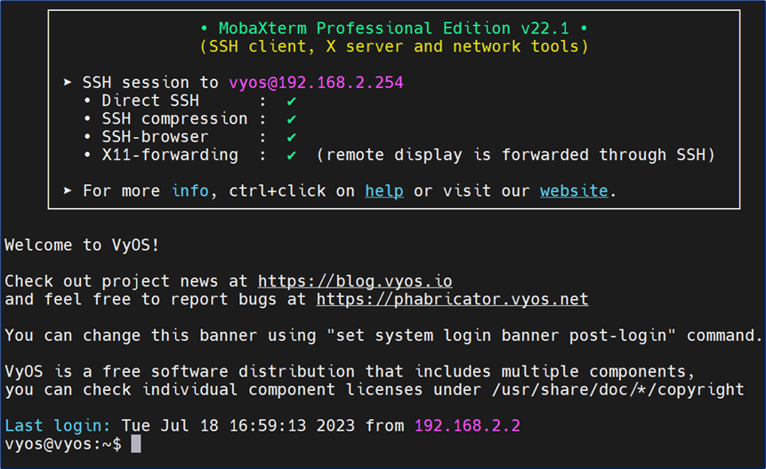 We then switched to our favorite SSH terminal tool of MobaXterm (or Putty) to validate we could access the Vyos software router remotely.