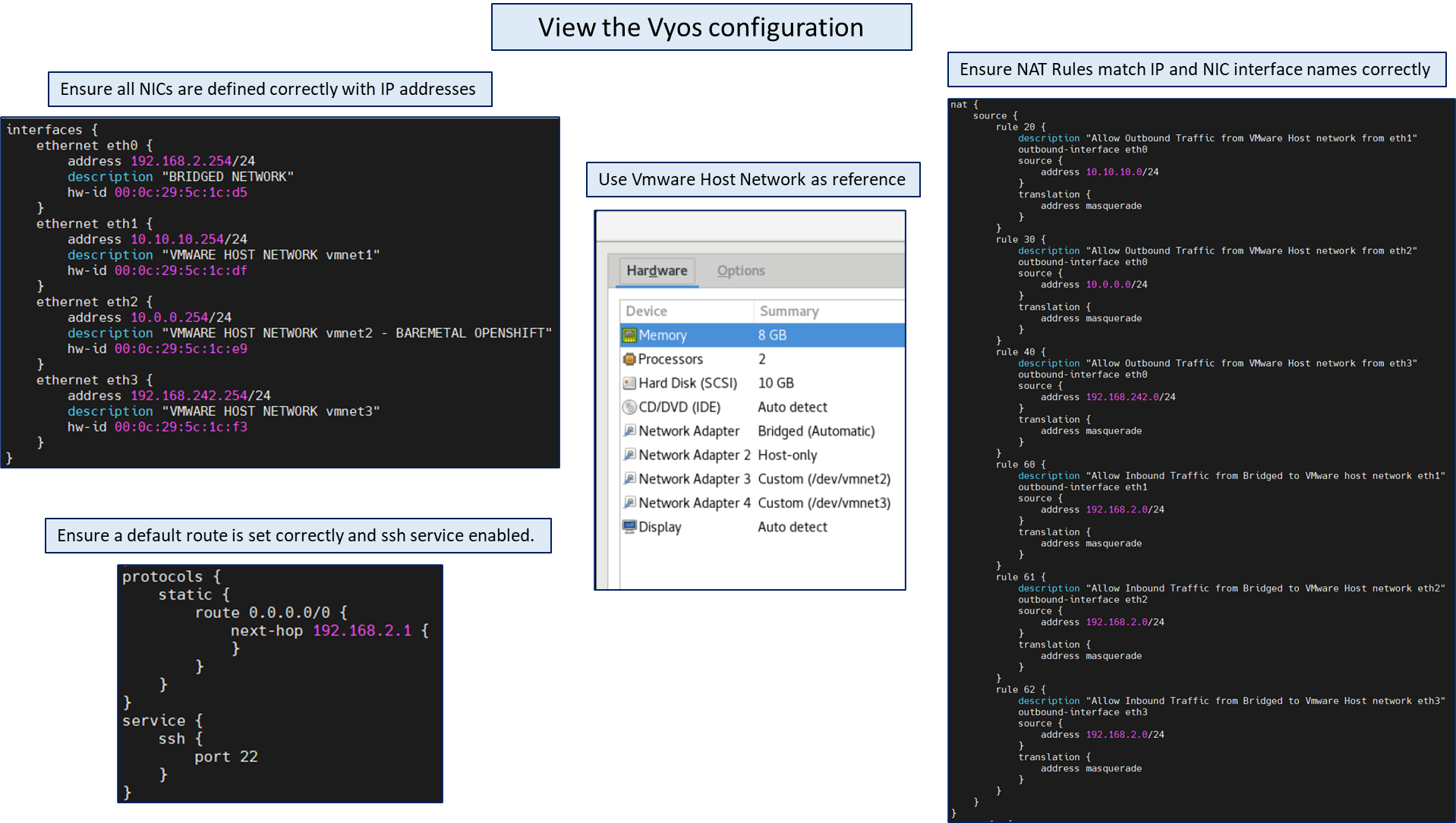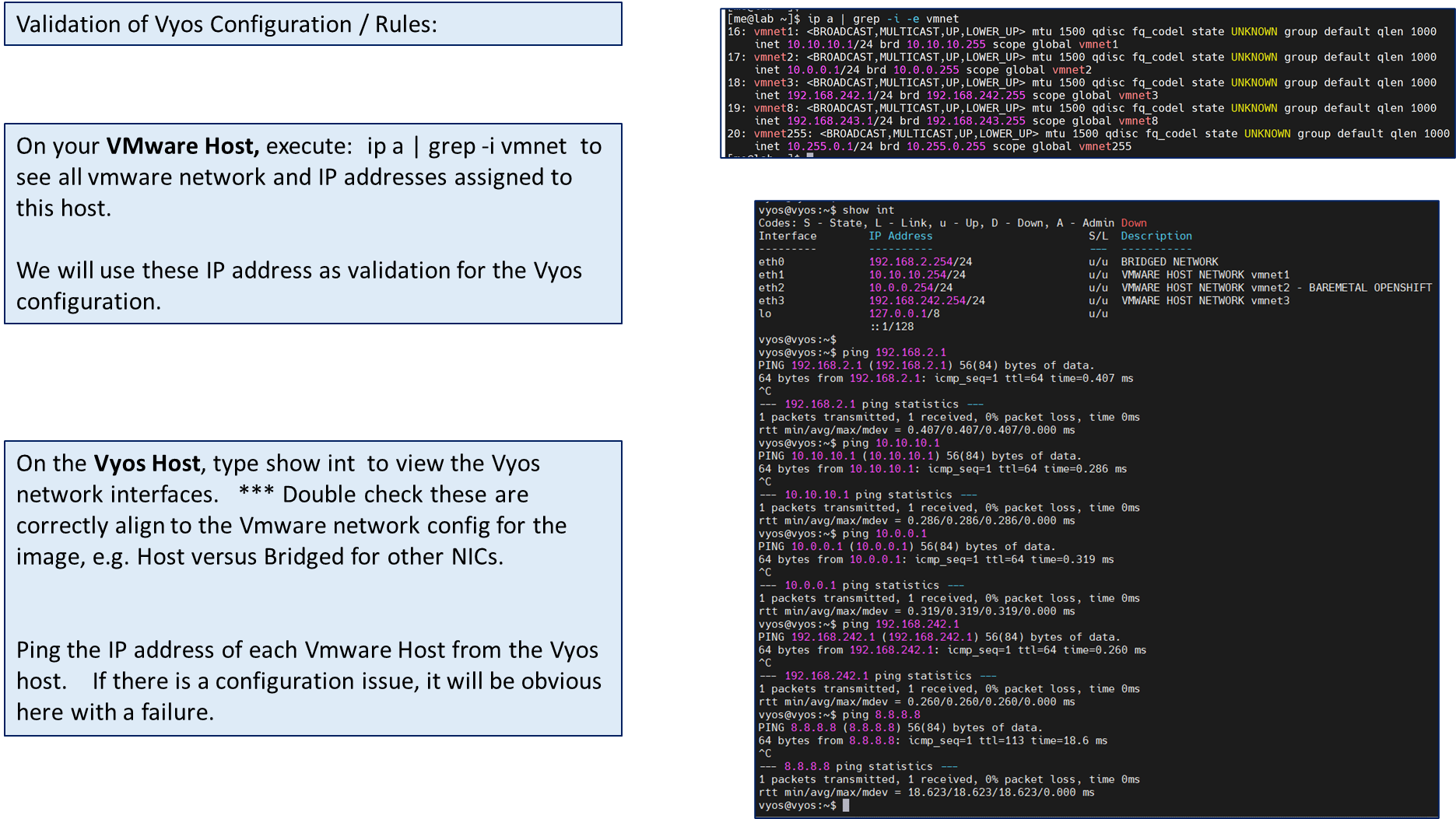 set interfaces ethernet eth2 description 'VMWARE HOST NETWORK vmnet2 - BAREMETAL OPENSHIFT'