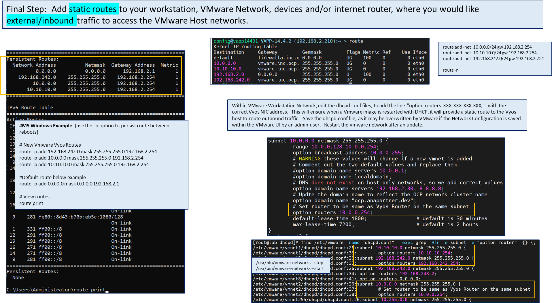 In the final step, we will add routing configuration on MS Windows OS and Linux OS to reach all four (4) networks from any external device and any VMware image on one of the four (4) networks.