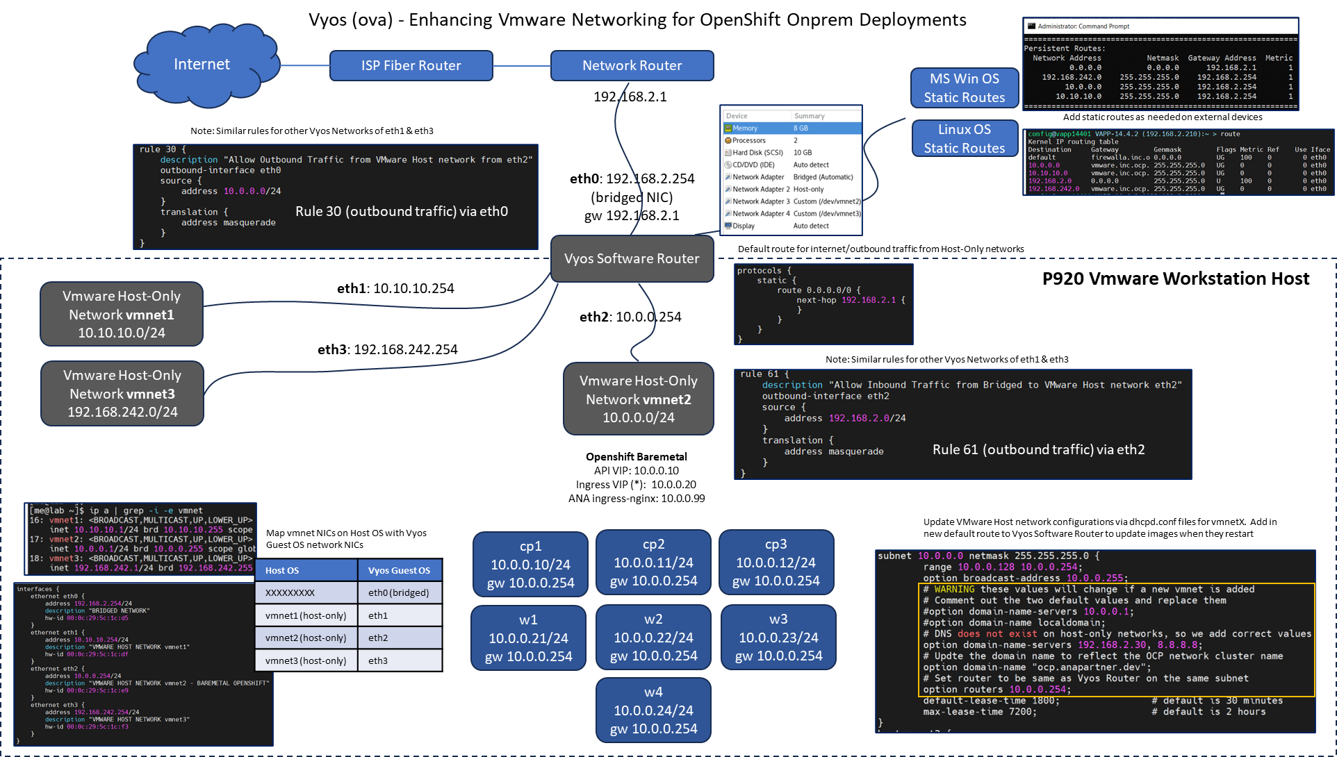 We now have the methodology to use over 250+ possible VMware host-only network segments for our networking labs with OpenShift and Kubernetes that require internet outbound and/or inbound access. We can standardize a unique host-only network segment to share with team members and clients for training/education/development. With the embedded tcpdump feature in Vyos Software router image, we can quickly address and isolate network routing configuration challenges.