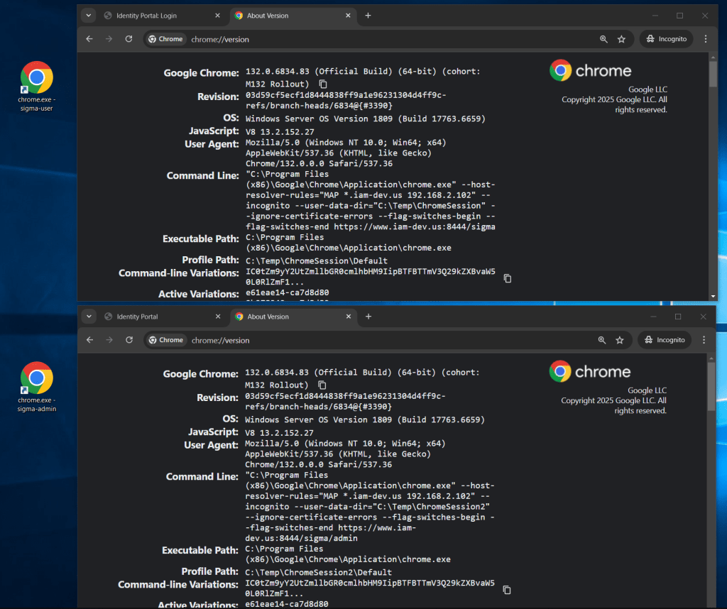 "C:\Program Files (x86)\Google\Chrome\Application\chrome.exe" \ --host-resolver-rules="MAP *.iam-dev.us 192.168.2.102" \ --incognito --user-data-dir="C:\Temp\ChromeSession" \ --ignore-certificate-errors \ https://www.iam-dev.us:8444/sigma