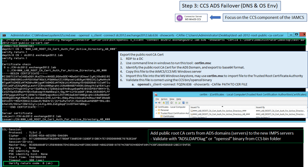 If using SSL over TCP 636 confirm the ADS Domain Root Certificate is deployed to the MS Windows Server where the CCS service is deployed. If using SASL over TCP 389 (if available), then no additional effort is required.