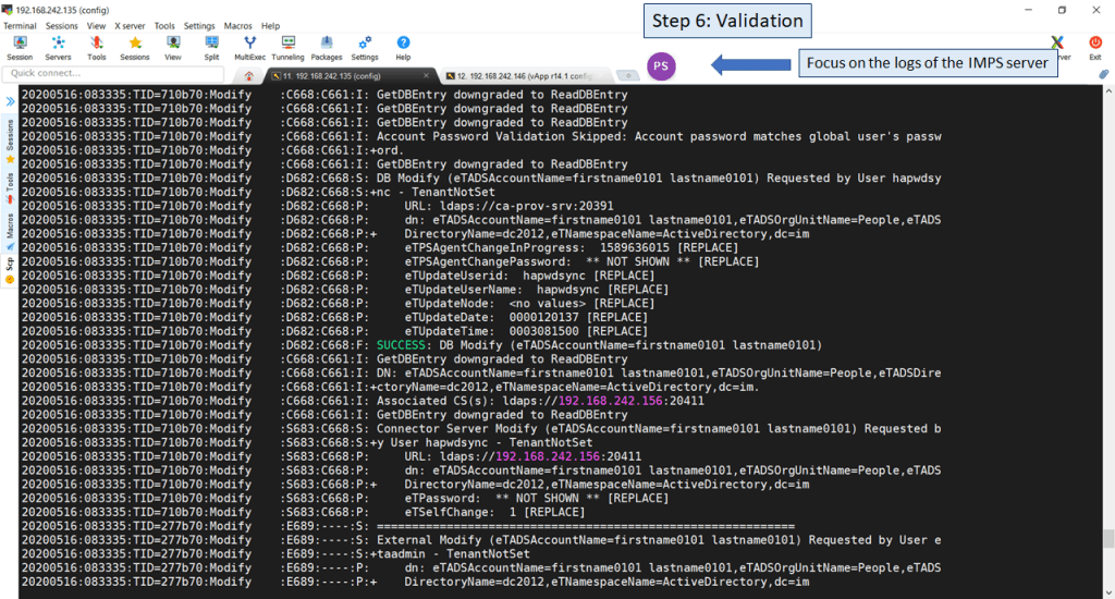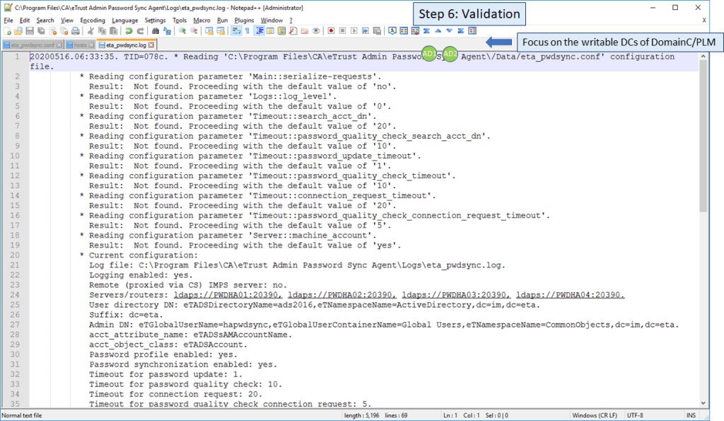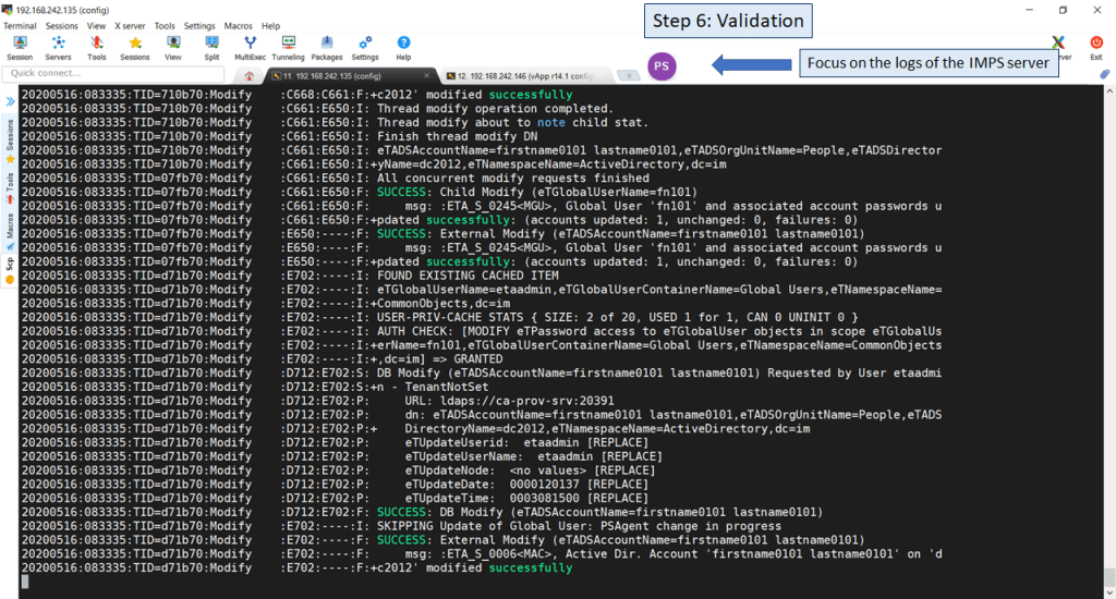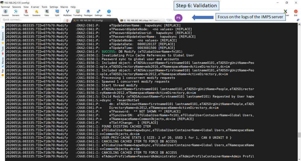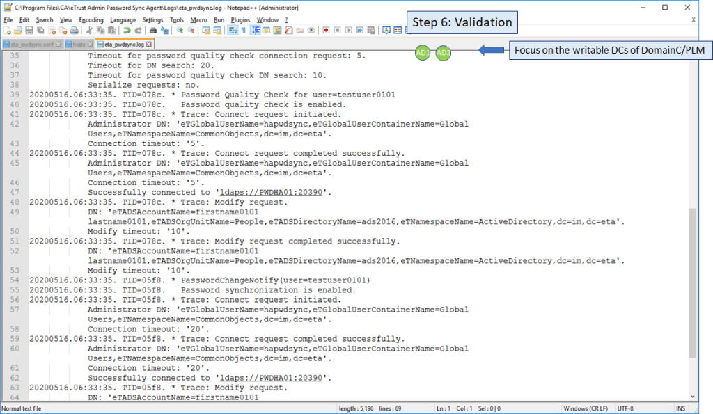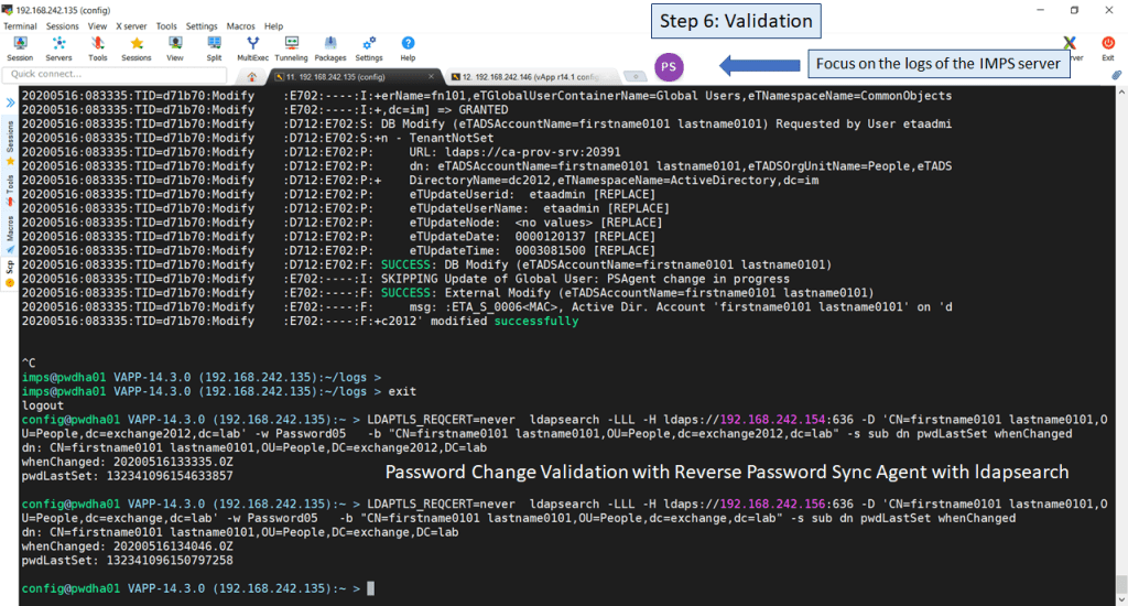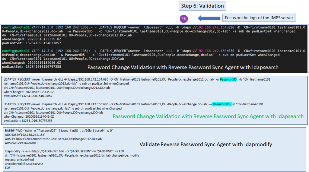 Using various MS Active Directory processes, we can emulate a delegated or self-service password change early during the configuration cycle, to confirm deployment is correct. The below example uses MS Powershell to select a writable MS ADS Domain Controller to update a user’s password. We can then monitor the logs at all tiers for completion of this password change event.