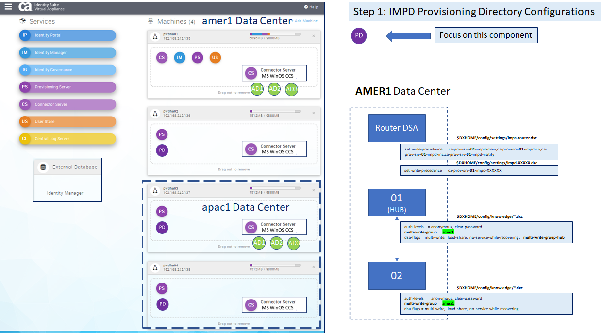 The Provisioning Server has no shared knowledge with other Provisioning Servers. The Provisioning Directory (Symantec Directory) is where the provisioning data may be set up in a multi-write peer model. Symantec Directory is a proper X.500 directory with high redundancy and is designed to manage WAN latency between remote data centers and recovery after an outage. See example provided below.