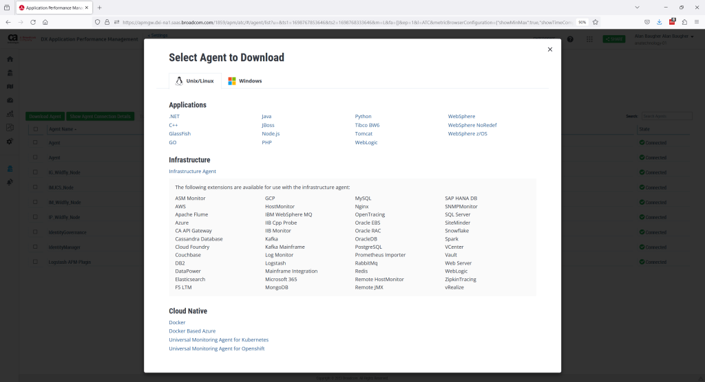 After you login to your DX OI/O2 instance, navigate to the settings/agents section. You can select an Agent, and your custom authentication token to use it will be embedded in the package. We plan to use the javaagent being offered for Wildfly (aka JBOSS) . Select this agent.