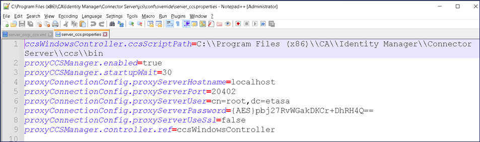 C:\Program Files (x86)\CA\Identity Manager\Connector Server\jcs\conf\override\server_ccs.properties [File contains the bind credentials and the service port to communicate to on localhost:20402. The password hash will be PBES or AES format depending if FIPS is enabled.]