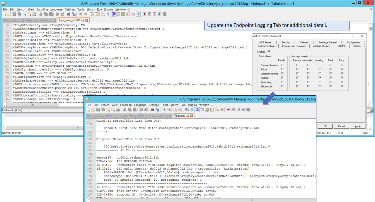 Example of verbose logs for Active Directory via the CCS’s ADS and JCS logs.